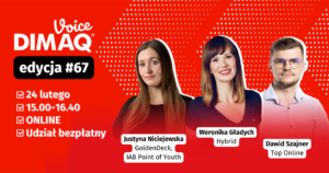 Już 24 lutego odbędzie się 67. edycja DIMAQ Voice – bezpłatnego webinaru dla osób z branży digital marketingu. Uczestnicy poznają kulisy prowadzenia warsztatów strategicznych w sytuacjach, gdy proces przestaje przebiegać zgodnie z założeniami. Będziemy także rozmawiać o tym jak połączyć mobile z szybko rosnącą rolą Connected TV i zastanowimy się, w którym kierunku zmierza dziś rozwój procesu zakupowego online, gdy AI zaczyna go przejmować?