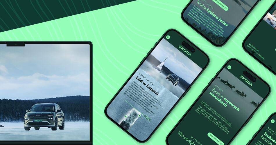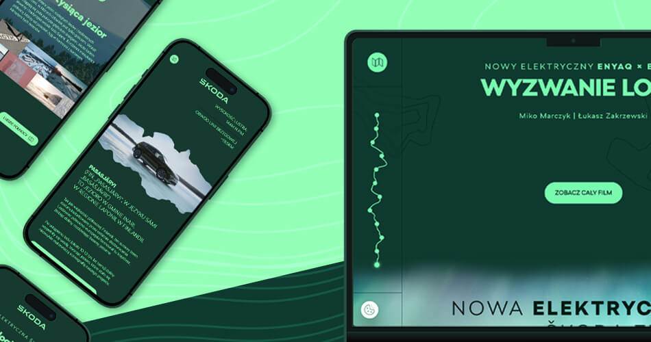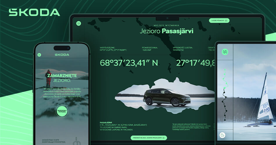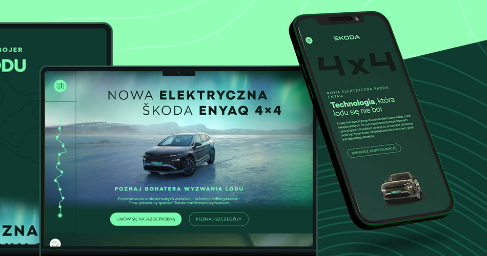 Dzięki naszemu podejściu landing page „Wyzwanie Lodu” stał się więcej niż tylko dodatkiem do kampanii. Strona intryguje i inspiruje. Niczym dobry film, rozbudza ciekawość i wyobraźnię, angażując użytkownika na poziomie emocjonalnym. Co więcej, urzeka formą. Przemyślana i zakotwiczona w charakterze konceptu estetyka, utwierdza odbiorcę w przekonaniu, że ma do czynienia z niezwykłą kampanią, co podbija wizerunek marki, a sam samochód ukazuje w wyjątkowym świetle. Nowa Škoda Enyaq 4×4 nie jest tu bowiem produktem w tle. Jest integralną częścią epickiej opowieści o precyzji, pasji i pokonywaniu granic. Jej obecność na tle dzikiej, lodowej scenerii zyskuje niezwykłą wiarygodność i siłę.
