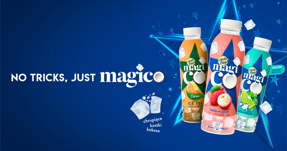 Hello Day! Magico to nowa marka z portfolio Agus. Na rynku wyróżnia się starannie dobranymi smakami oraz sprężystymi, chrupiącymi kostkami kokosa, znanymi pod nazwą nata de coco. Zanurzone w napoju, świetnie wzbogacają konsumpcję o element sensorycznej przyjemności.