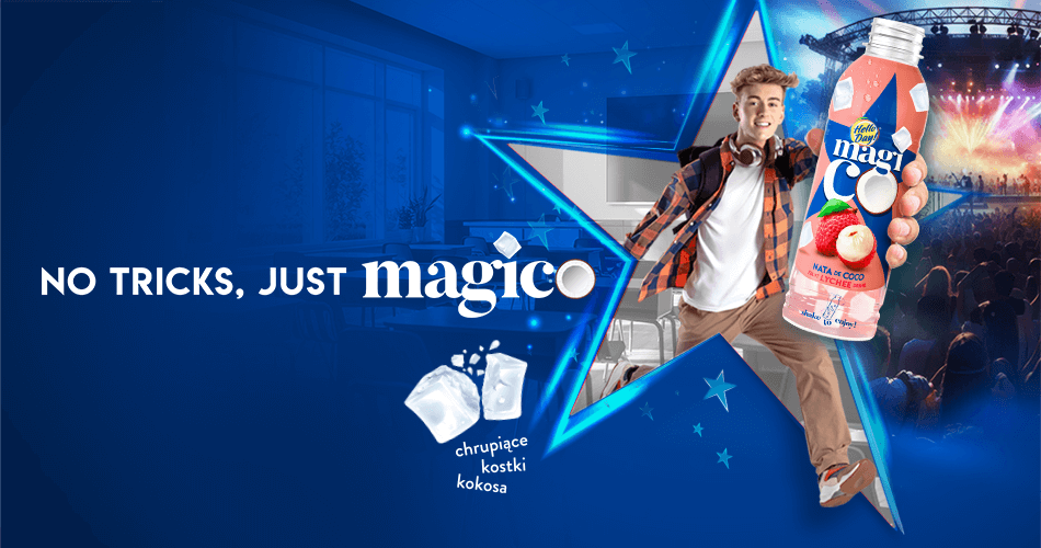 „no tricks, just Magico”– usłyszeć możemy w nowej kampanii reklamowej marki napojów z chrupiącymi kostkami kokosa. Gwiazdy Magico, zielone dla serii ice tea i niebieskie dla serii owocowej, zabłysną w całej Polsce.