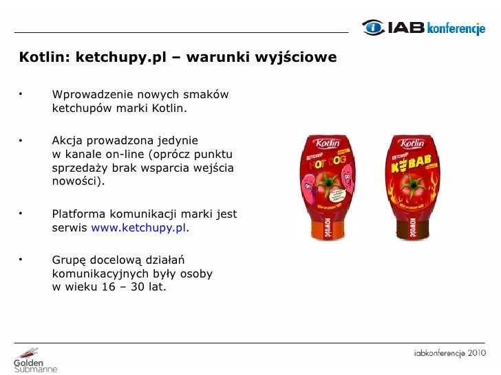 - 10. Kotlin: ketchupy.pl – warunki wyjściowe <ul><li>Wprowadzenie nowych smaków ketchupów marki Kotlin. </li></ul><ul><li>Akcja prowadzona jedynie w kanale on-line (oprócz punktu sprzedaży brak wsparcia wejścia nowości). </li></ul><ul><li>Platforma komunikacji marki jest serwis www.ketchupy.pl . </li></ul><ul><li>Grupę docelową działań komunikacyjnych były osoby w wieku 16 – 30 lat. </li></ul>