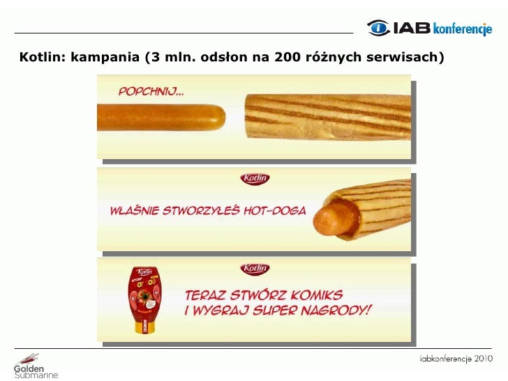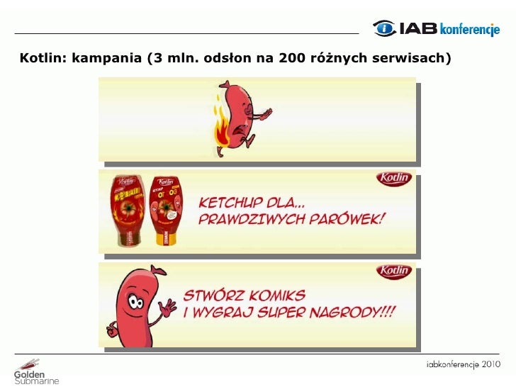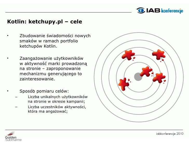 - 11. Kotlin: ketchupy.pl – cele <ul><li>Zbudowanie świadomości nowych smaków w ramach portfolio ketchupów Kotlin. </li></ul><ul><li>Zaangażowanie użytkowników w aktywność marki prowadzoną na stronie – zaproponowanie mechanizmu generującego to zainteresowanie. </li></ul><ul><li>Sposób pomiaru celów: </li></ul><ul><ul><li>Liczba unikalnych użytkowników na stronie w okresie kampanii; </li></ul></ul><ul><ul><li>Liczba uczestników aktywności, która ma angażować; </li></ul></ul>