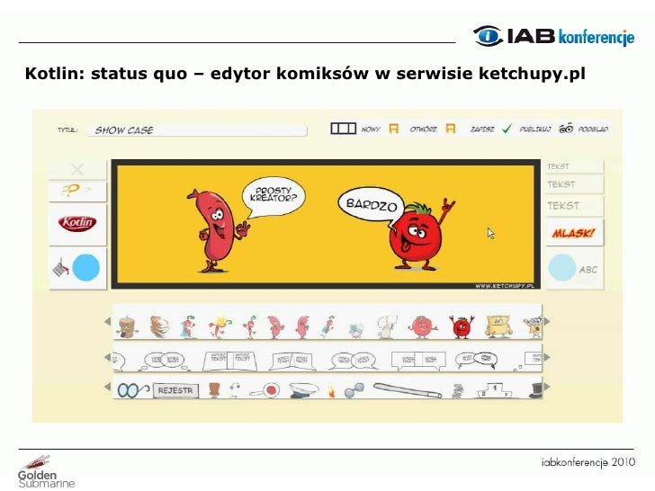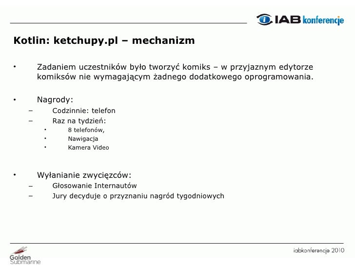 - 13. Kotlin: ketchupy.pl – mechanizm <ul><li>Zadaniem uczestników było tworzyć komiks – w przyjaznym edytorze komiksów nie wymagającym żadnego dodatkowego oprogramowania. </li></ul><ul><li>Nagrody: </li></ul><ul><ul><li>Codzinnie: telefon </li></ul></ul><ul><ul><li>Raz na tydzień: </li></ul></ul><ul><ul><ul><li>8 telefonów, </li></ul></ul></ul><ul><ul><ul><li>Nawigacja </li></ul></ul></ul><ul><ul><ul><li>Kamera Video </li></ul></ul></ul><ul><li>Wyłanianie zwycięzców: </li></ul><ul><ul><li>Głosowanie Internautów </li></ul></ul><ul><ul><li>Jury decyduje o przyznaniu nagród tygodniowych </li></ul></ul>