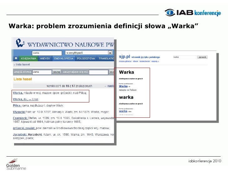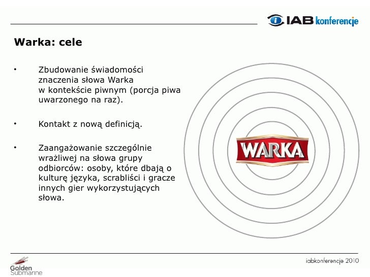 - 33. Warka: cele <ul><li>Zbudowanie świadomości znaczenia słowa Warka w kontekście piwnym (porcja piwa uwarzonego na raz). </li></ul><ul><li>Kontakt z nową definicją. </li></ul><ul><li>Zaangażowanie szczególnie wrażliwej na słowa grupy odbiorców: osoby, które dbają o kulturę języka, scrabliści i gracze innych gier wykorzystujących słowa. </li></ul>