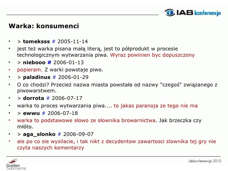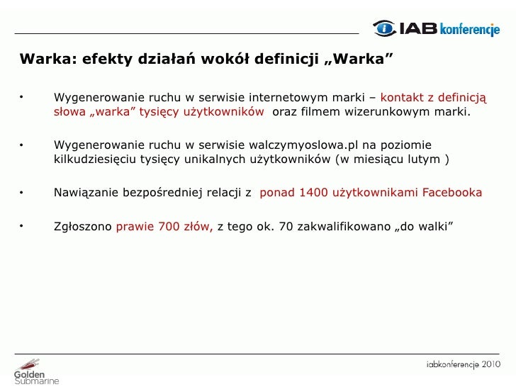 - 41. Warka: efekty działań wokół definicji „Warka” <ul><li>Wygenerowanie ruchu w serwisie internetowym marki – kontakt z definicją słowa „warka” tysięcy użytkowników oraz filmem wizerunkowym marki. </li></ul><ul><li>Wygenerowanie ruchu w serwisie walczymyoslowa.pl na poziomie kilkudziesięciu tysięcy unikalnych użytkowników (w miesiącu lutym ) </li></ul><ul><li>Nawiązanie bezpośredniej relacji z ponad 1400 użytkownikami Facebooka </li></ul><ul><li>Zgłoszono prawie 700 złów, z tego ok. 70 zakwalifikowano „do walki” </li></ul>