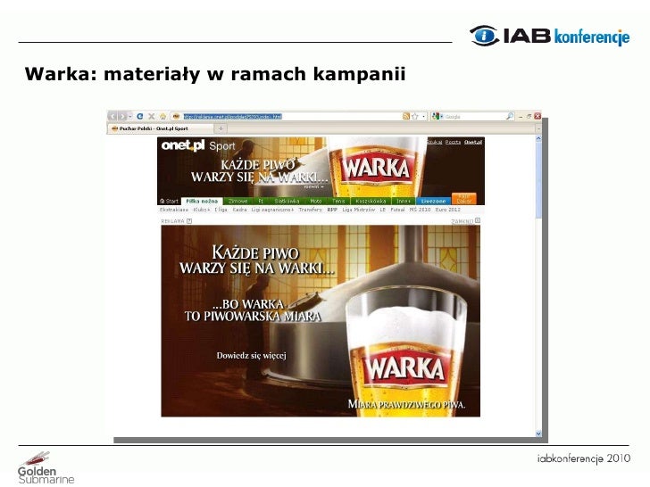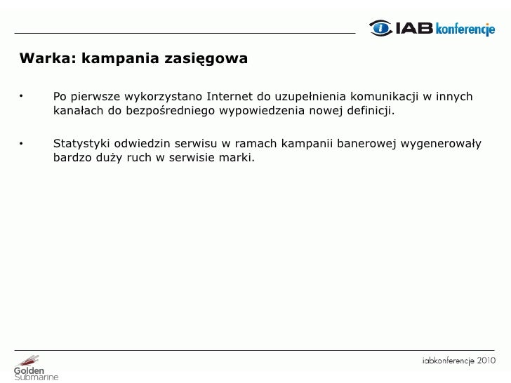 - 34. Warka: kampania zasięgowa <ul><li>Po pierwsze wykorzystano Internet do uzupełnienia komunikacji w innych kanałach do bezpośredniego wypowiedzenia nowej definicji. </li></ul><ul><li>Statystyki odwiedzin serwisu w ramach kampanii banerowej wygenerowały bardzo duży ruch w serwisie marki. </li></ul>