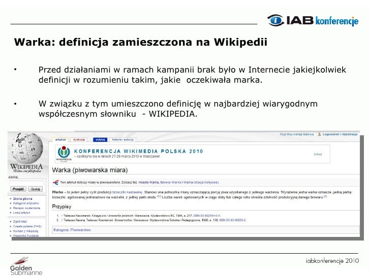 - 40. Warka: definicja zamieszczona na Wikipedii <ul><li>Przed działaniami w ramach kampanii brak było w Internecie jakiejkolwiek definicji w rozumieniu takim, jakie oczekiwała marka. </li></ul><ul><li>W związku z tym umieszczono definicję w najbardziej wiarygodnym współczesnym słowniku – WIKIPEDIA. </li></ul>