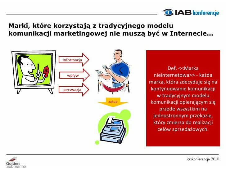 - 5. Marki, które korzystają z tradycyjnego modelu komunikacji marketingowej nie muszą być w Internecie… Informacja perswazja wpływ zakup Def. <<Marka nieinternetowa>> – każda marka, która zdecyduje się na kontynuowanie komunikacji w tradycyjnym modelu komunikacji opierającym się przede wszystkim na jednostronnym przekazie, który zmierza do realizacji celów sprzedażowych.