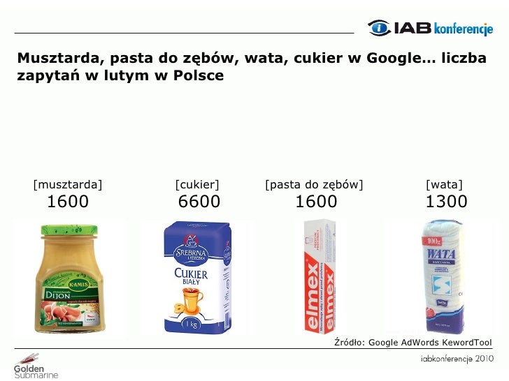 - 7. Musztarda, pasta do zębów, wata, cukier w Google… liczba zapytań w lutym w Polsce <ul><li>[musztarda] 1600 </li></ul>Źródło: Google AdWords KewordTool [cukier] 6600 [pasta do zębów] 1600 [wata] 1300