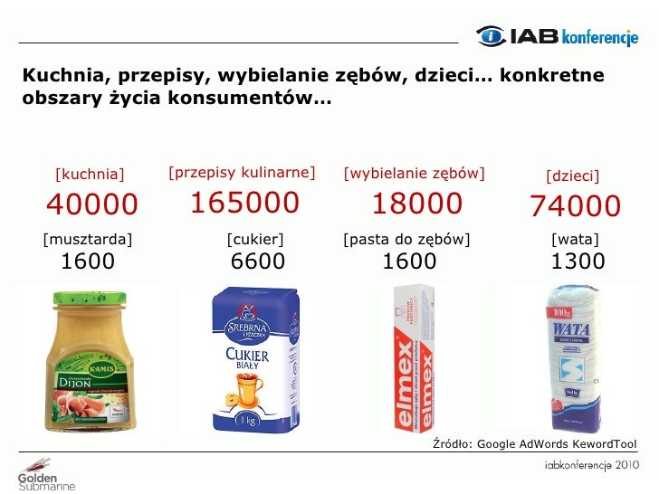 - 8. Kuchnia, przepisy, wybielanie zębów, dzieci… konkretne obszary życia konsumentów… <ul><li>[musztarda] 1600 </li></ul>Źródło: Google AdWords KewordTool [cukier] 6600 [pasta do zębów] 1600 [wata] 1300 [dzieci] 74000 [wybielanie zębów] 18000 [przepisy kulinarne] 165000 [kuchnia] 40000
